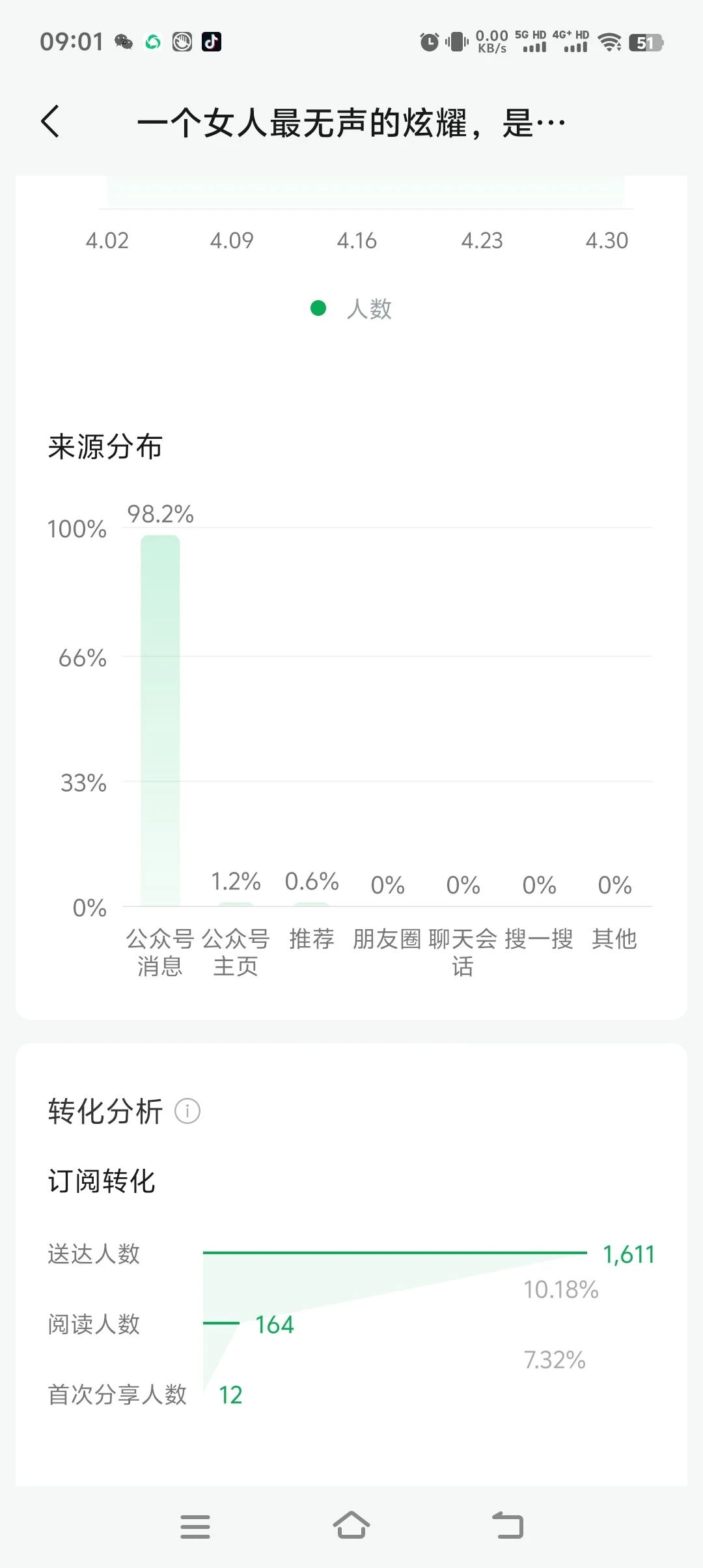 您好,我的公众号【暖韧】,ID:【gh_cd2e3b476454】,近期出现明显的推荐分发异常,特此申请人工核实处理。 1. 异常表现:近多篇文章的「推荐/看一看」流量占比长期低于1%,其中一篇文章的阅读来源中,公众号消息占比高达98.2%,推荐流量仅为0.6%,几乎无任何公域自然流量,疑似被限制了推荐分发权限。 2. 自查情况: - 账号无任何违规通知、处罚记录; - 无刷量、互阅、违规营销等行为; - 内容均为女性成长/自我提升赛道的原创内容,已自查无敏感词、无违规引导、无广告堆砌。 3. 诉求:麻烦帮我核实账号是否存在隐性限流或推荐分发异常,若系统存在误判,能否协助恢复正常的公域推荐权限?