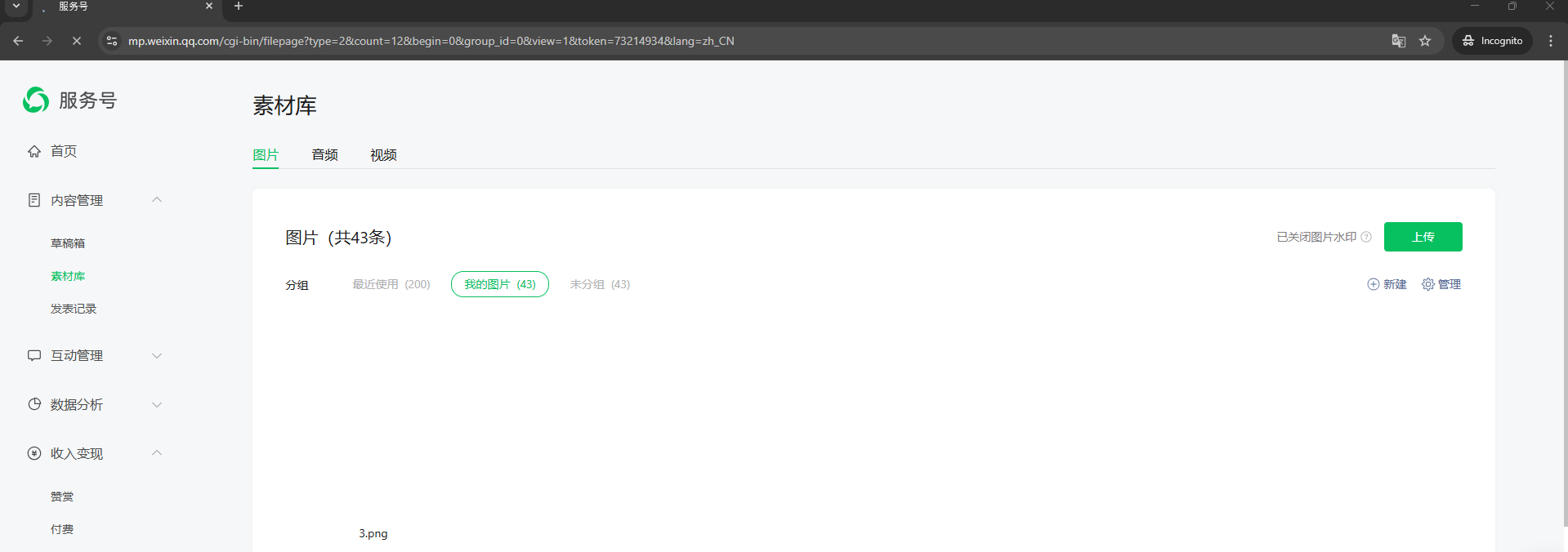 微信服务号内容管理,图片好不容易上载了却是空白的。怎么解决啊,户口已经认证了。