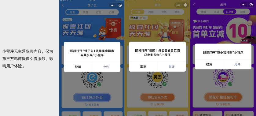 跳转小程序既然有这个功能,加一两个小程序也很常见,别的小程序也有加美团饿了么跳转的,如若这也违规,为啥不关掉跳转小程序功能?