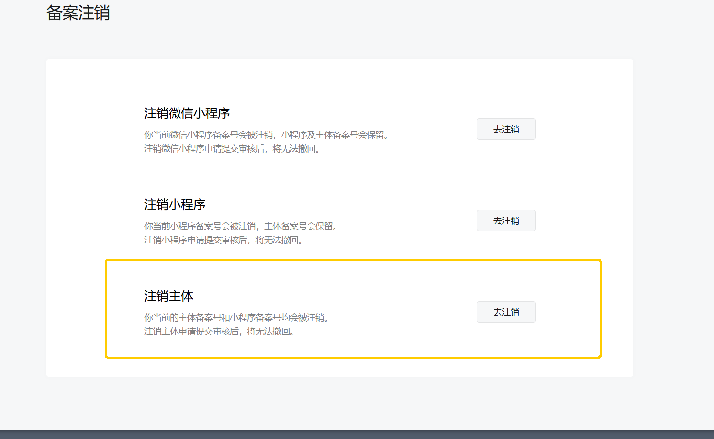 选择【注销微信小程序】,直接提交到通管局审核注销;