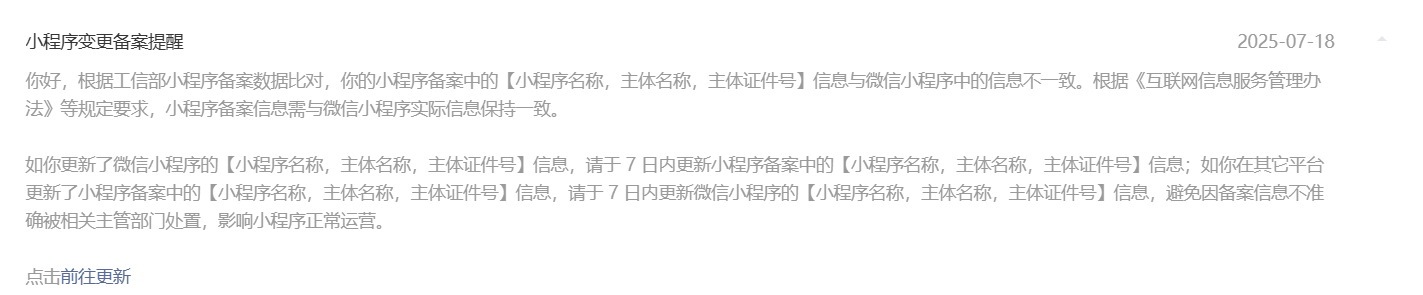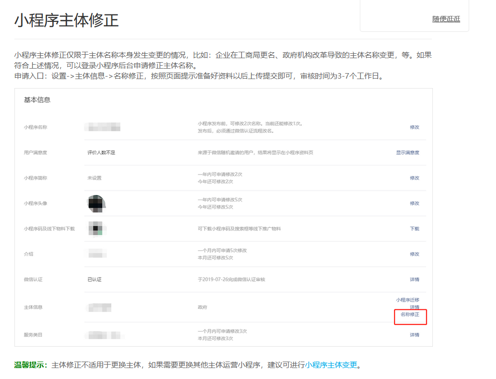 但我查了小程序备案变更规则,仅主体名称发生改变的(其余信息没变),是可以通过【小程序备案】-【变更】来进行变更操作的 为什么这个小程序不行??