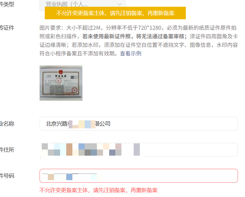 小程序主体公司名称变了,仅公司名称变了,我选择【小程序备案】-【变更】 ,上传了新的营业执照,提醒不允许,要注销备案,见下图