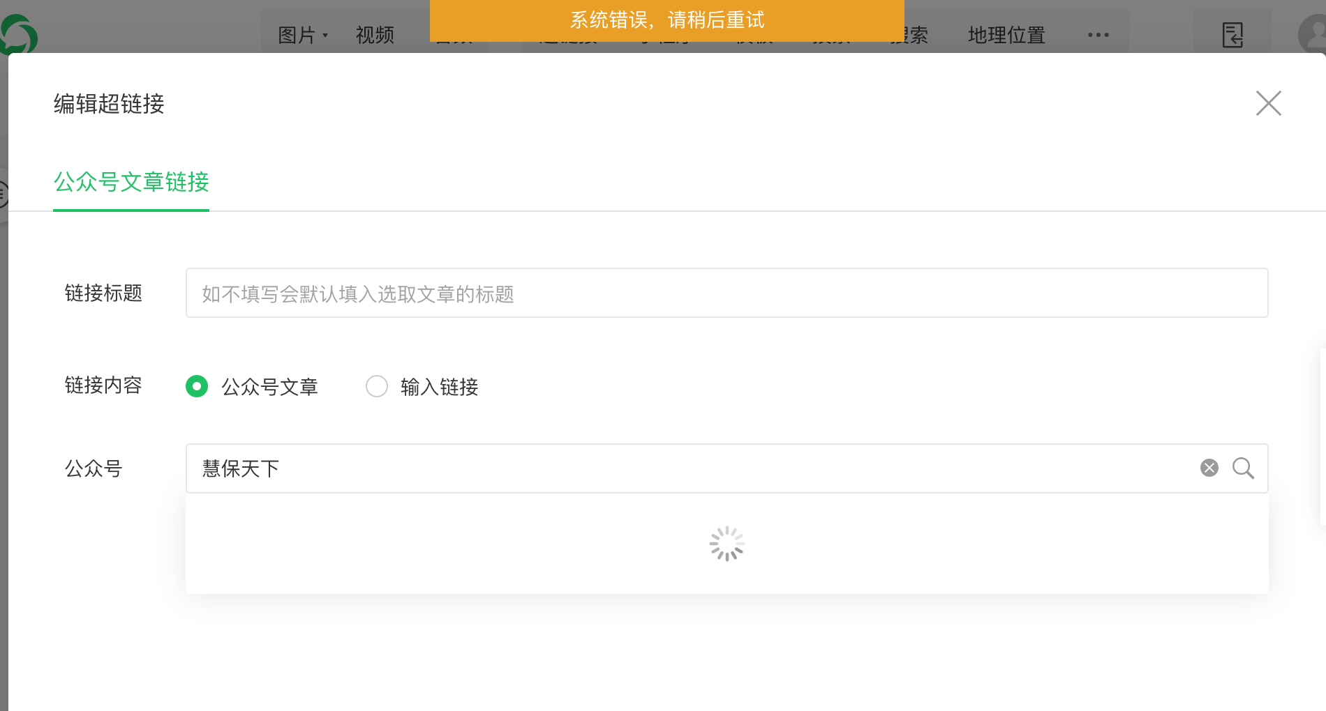在图文编辑中,添加超链接,选择其它公众号,搜索公众号名字的时候,显示系统错误,请稍后重试