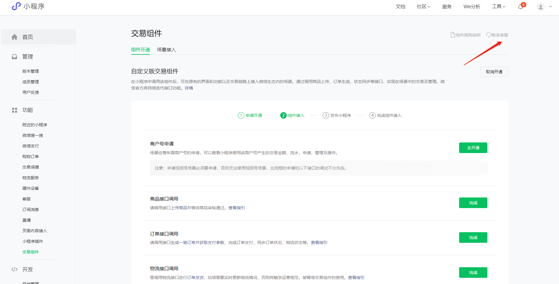 登陆https://mp.weixin.qq.com/-交易组件-右上角联系客服 咨询下组件客服