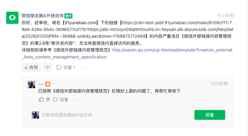 你好,经审核,域名【91yunebao.com】下的链接【https://cdn-test-yebf.91yunebao.com/index/6109cf71-79a9-428e-954c-5b96077cd17b?https://alb-m0zoyn09qtbtt0ouh5.cn-heyuan.alb.aliyuncsslb.com/files/data/2026/01/20/PRN--36968-uoIk4y.aac&time=1768875712469】的内容严重违反《微信外部链接内容管理规范》的第2.6条“欺诈类内容”,无法恢复微信内直接访问的服务。