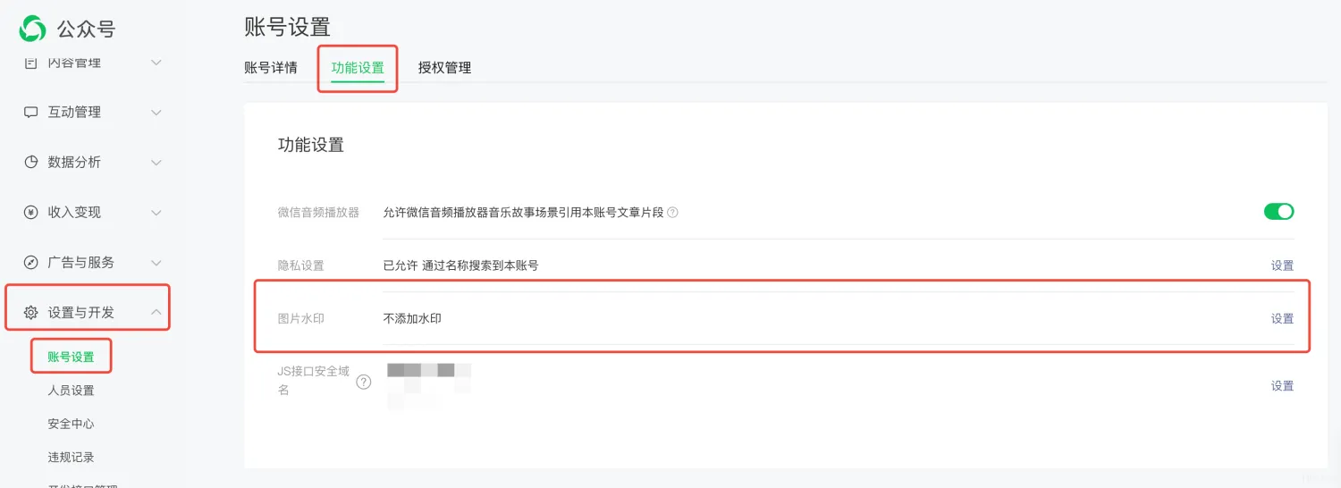 如果是的话,前往 设置与开发 -> 账号设置 -> 功能设置 -> 图片水印 -> 设置为“不添加” ,设置之后上传的图片就不会添加水印的了。