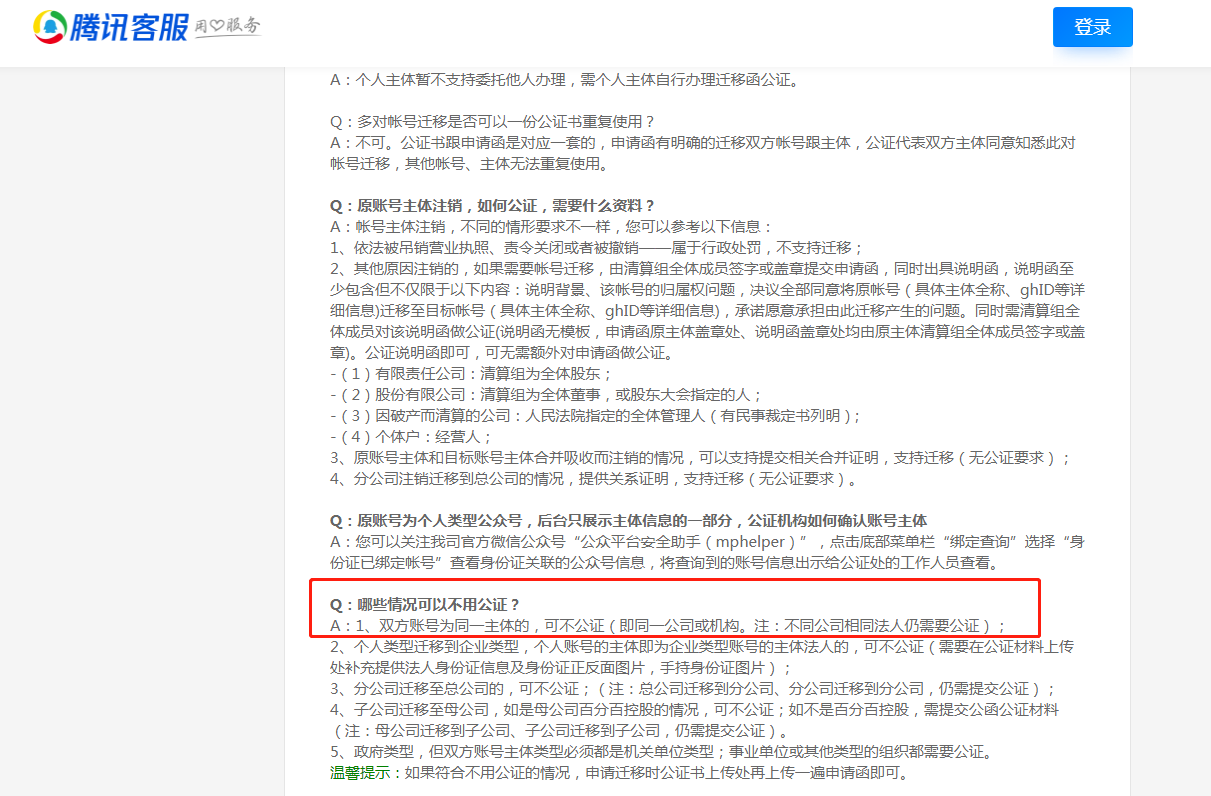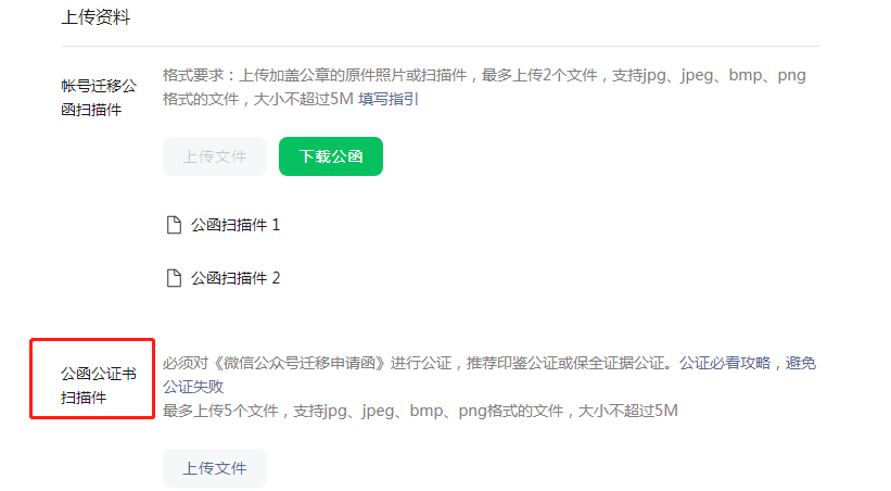 【问题描述】: 公众号迁移的公证,指引上写“双方账号为同一主体的,可不公证”,我的两个公众号主体一致,在填写资料的公函公证书扫描件部分,要上传什么?