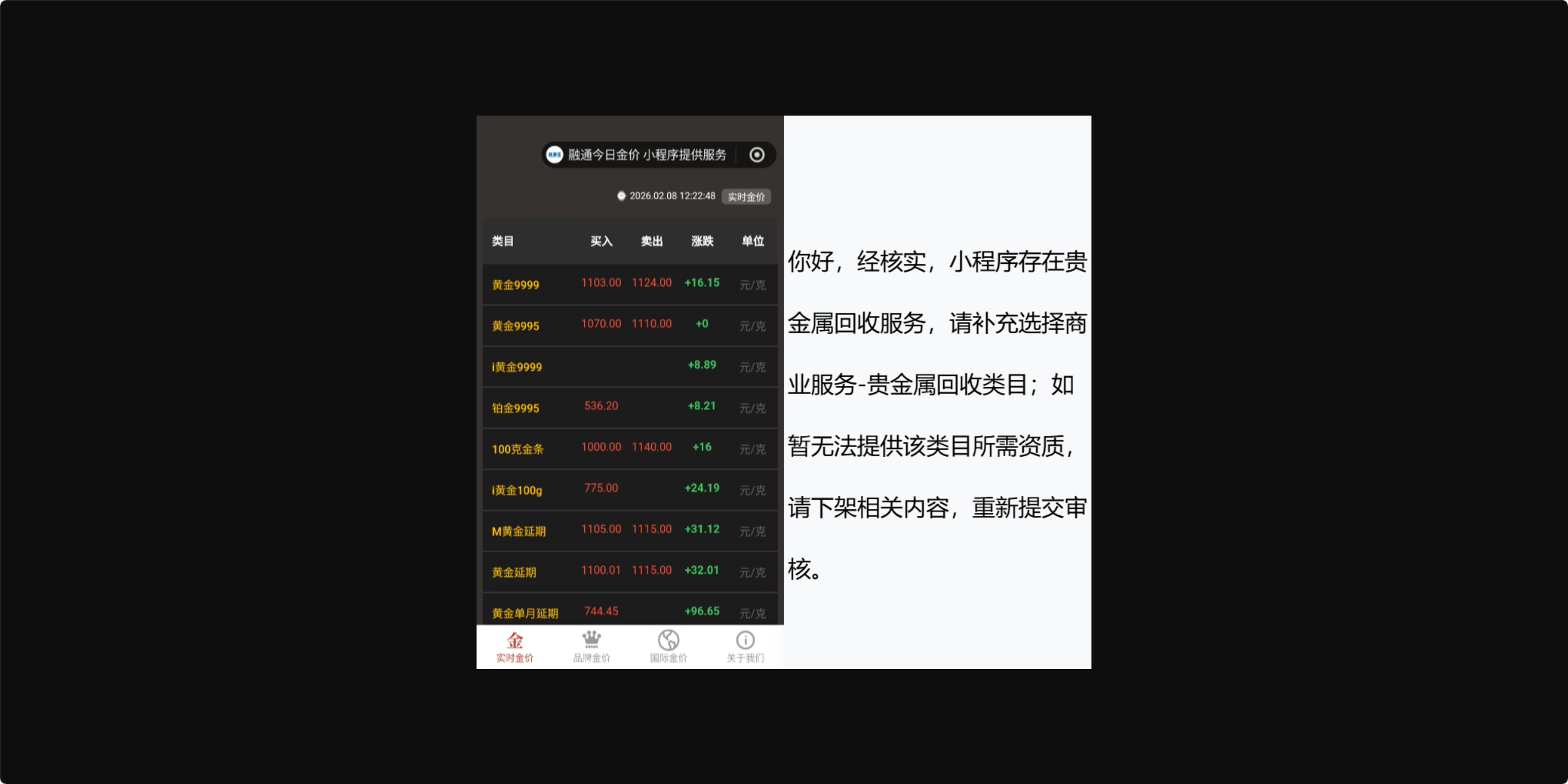 有没有谁能回答一下我的疑惑?明明各方面的回复都是只提供价格信息,不存在涉及任何贵金属回收服务和任何销售服务,为什么申诉就是不通过?永远都是说我涉及贵金属回收服务!这到底是人工审核还是机器审核?