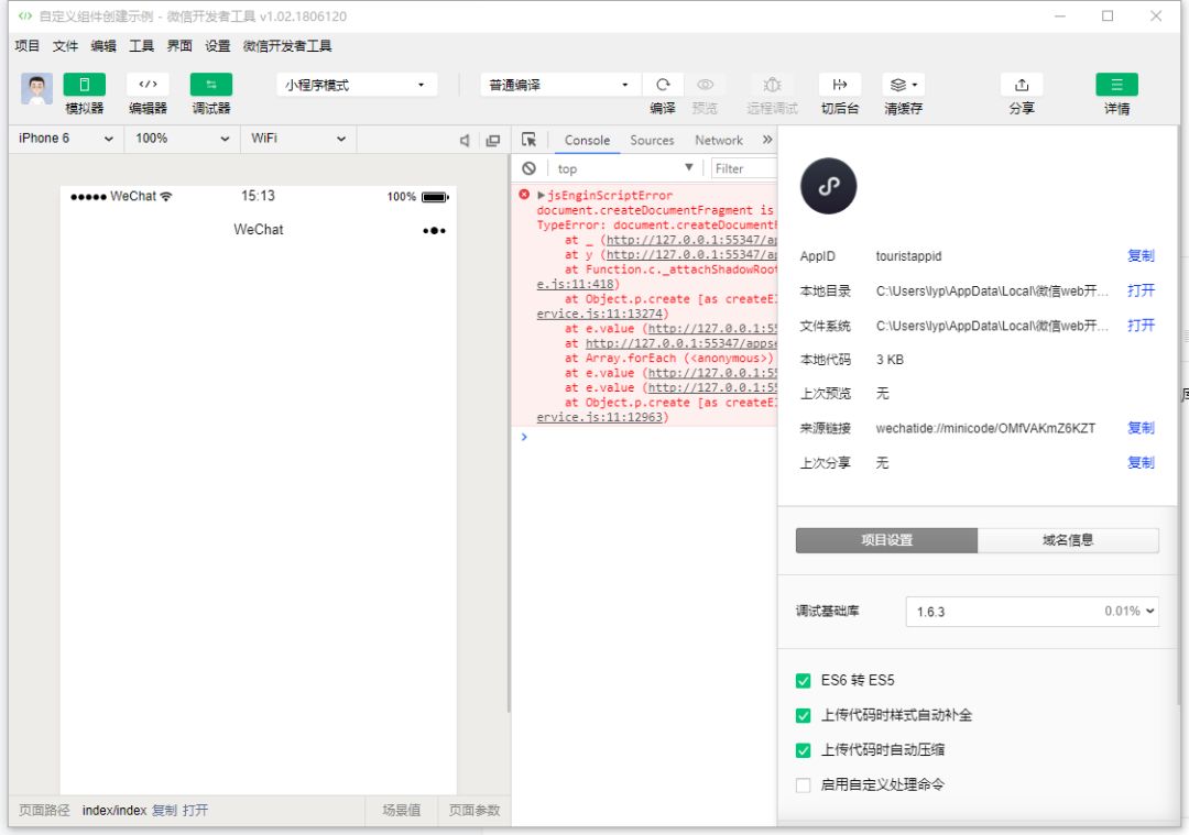 然后将开发者工具的基础库版本切换为1.6.3,开发者工具报错: