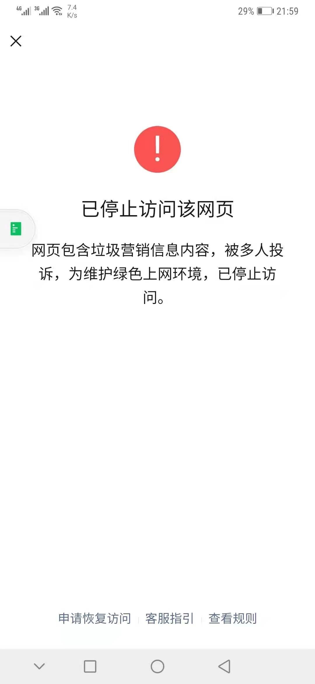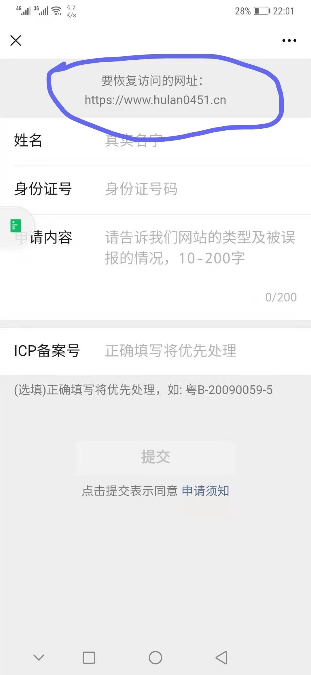 您好!我司微信域名被封:https://www.hulan0451.cn链接很神奇,有时候能打开有时候打不开。我们检查过几次相关链接网页都没发现存在诱导分享或关注的内容,两次申请恢复访问都是无反应;我们的备案号是。黑ICP备19001584号,我们有ICP许可证。所以恳请帮忙指出具体的问题所在,以便我们删除修改,早日恢复上线,不胜感激!