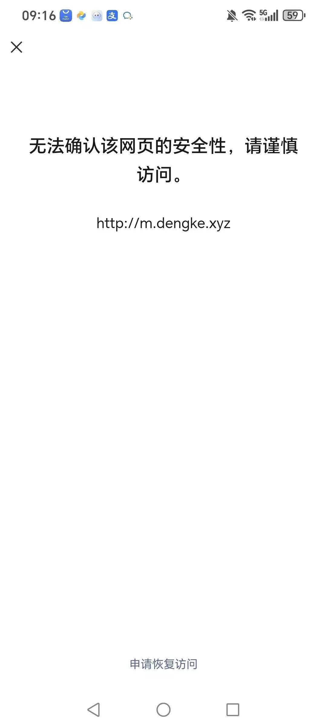 您好,域名dengke.xyz在西部数码注册并通过优刻得备案通过,http://m.dengke.xyz浏览器访问正常,我是网站开发者,访问时间如图2026/1/9,点开网址提示“无法确认该网页的安全性,请谨慎访问。”经检查网页里没有不安全的内容,请核实后帮忙解除拦截,谢谢!尽快处理,急急急,现在需要打开使用,谢谢!