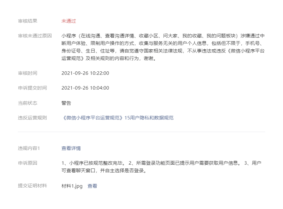 小程序涉嫌通过中断用户体验、限制用户操作的方式(沟通房源、收藏小区、一键咨询、发布找房、我的问答等板块需强制绑定手机号码/输入手机号码),收集与服务无关的用户个人信息,包括但不限于,手机号、身份证号、生日、住址等,请自觉遵守国家相关法律法规,不从事违法或违反《微信小程序平台运营规范》及相关规则的内容和行为,谢谢。