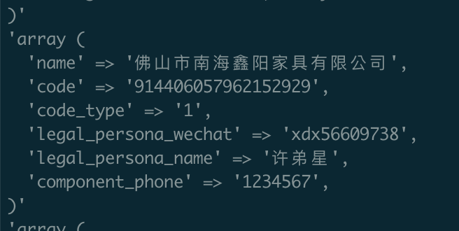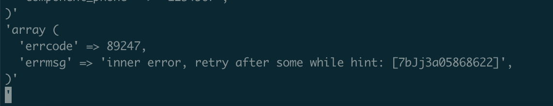 请求数据:array ('name' => '佛山市南海鑫阳家具有限公司','code' => '914406057962152929','code_type' => '1','legal_persona_wechat' => 'xdx56609738','legal_persona_name' => '许弟星','component_phone' => '1234567',)'返回数据:'array ('errcode' => 89247,'errmsg' => 'inner error, retry after some while hint: [7bJj3a05868622]',)''