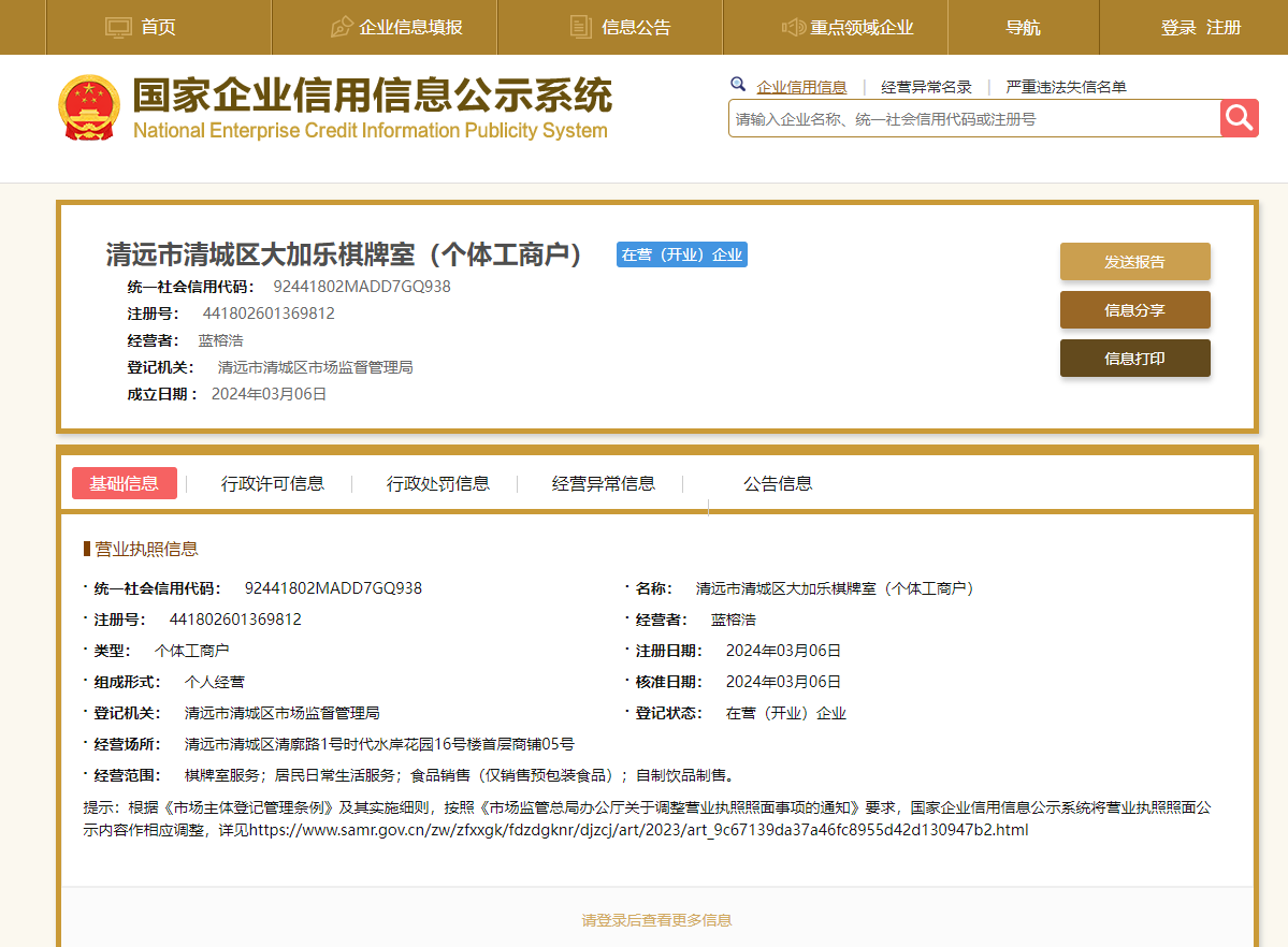 统一社会信用代码: 92441802MADD7GQ938 名称: 清远市清城区大加乐棋牌室(个体工商户) 注册号: 441802601369812 经营者: 蓝榕浩