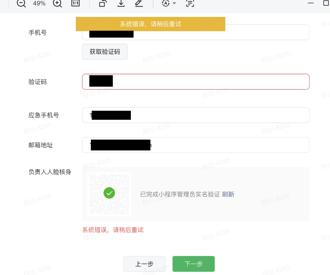 小程序备案时,人脸识别、验证码都通过了,点击下一步就提示系统错误,是什么问题