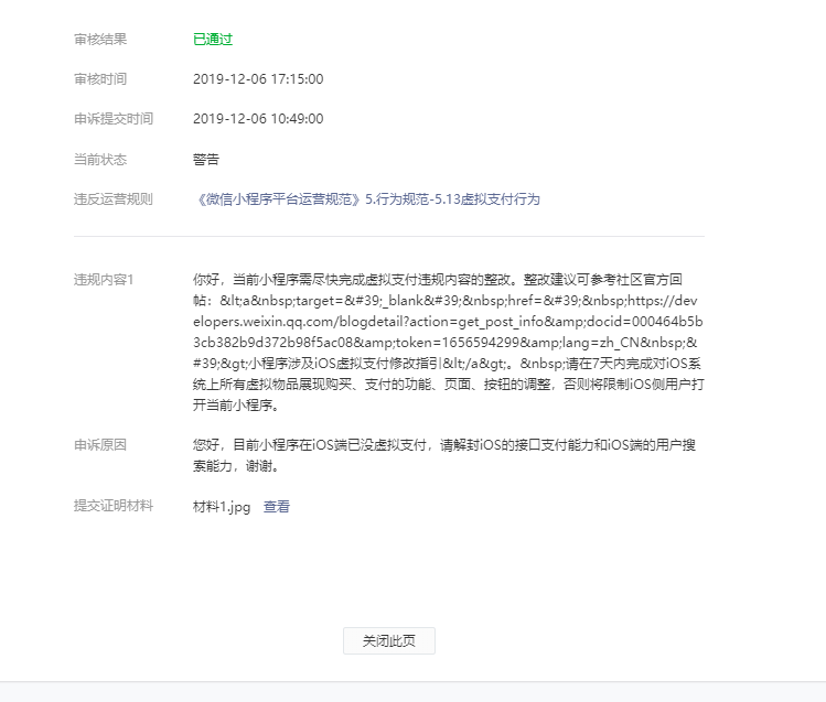 小程序ios端支付被封禁,已做相应的调整,12月6号申诉已通过,为何还是警告状态,现在ios端还是无法支付?请求解除