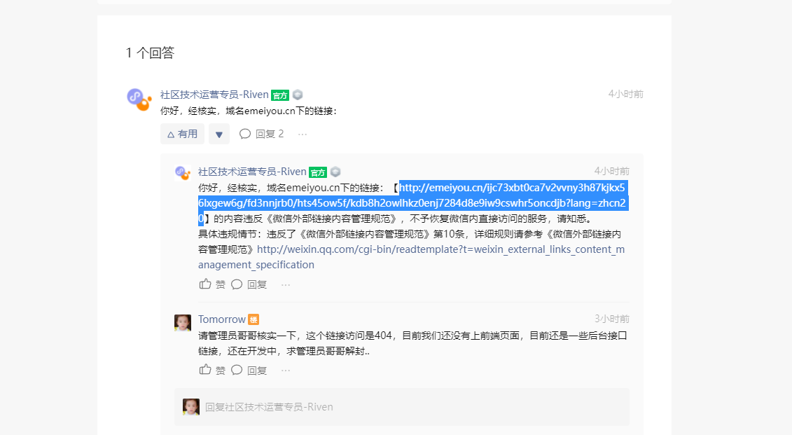 公司于2021年9月24日购买的新域名,于2021年10月25日通过备案,现在被微信拦截限制。我已在社区反映了2次该问题了。社区管理员的回答是此链接违规了,如下图所示:
