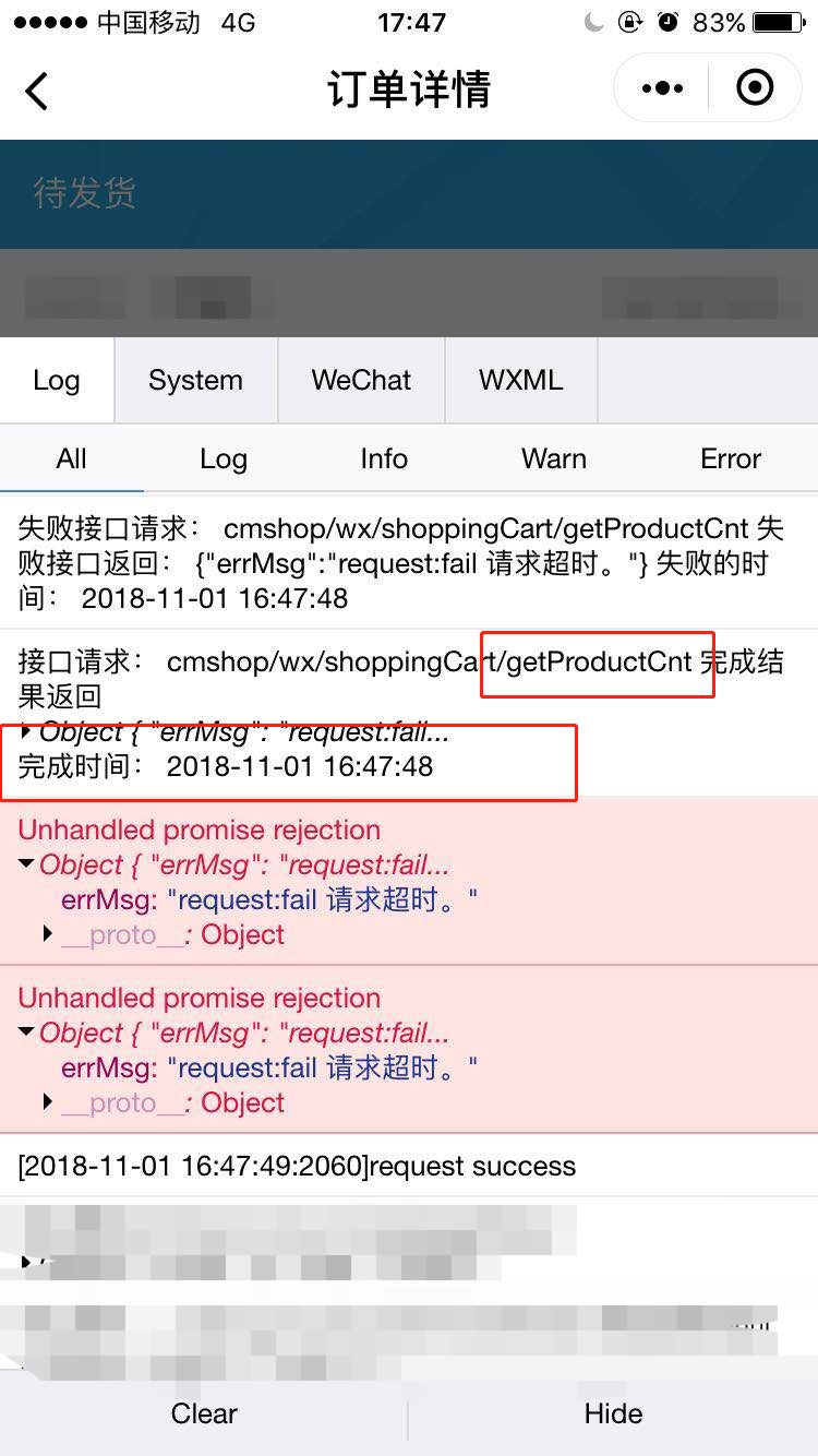 3、接下来就是响应,首先是getProductCnt请求失败,可以看到,红框中请求失败的时间是2018-11-01 16:47:48,非常标准的符合10s超时,下面也有小程序报出来的超时错误