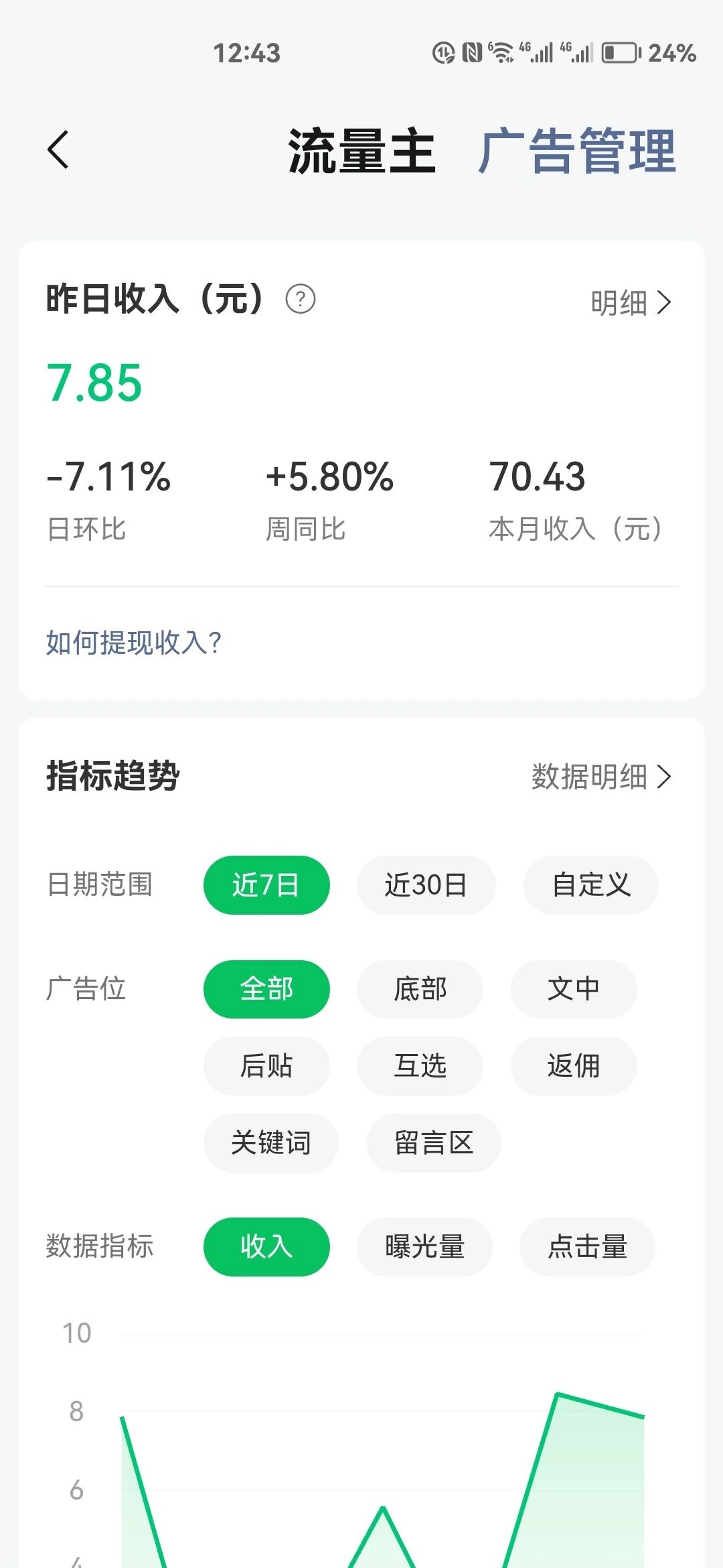 你好,请电脑登录MP后台查看。公众号流量主广告收入是自动结算,半月结,无需人工操作提现。结算规则及流程可参考:https://ad.weixin.qq.com/docs/293