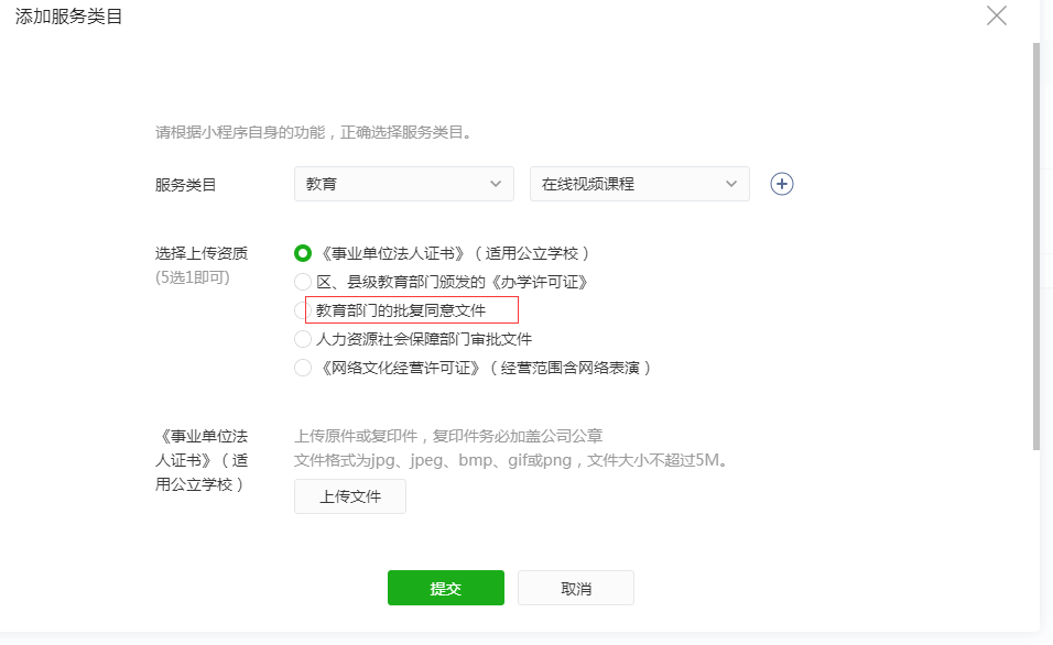 关于我图片中红框标出的这样项教育部门的批复同意文件,我在类目资质网址https://developers.weixin.qq.com/miniprogram/product/material.html中没有找到相关的样例,麻烦这一项能提供一下样例吗?