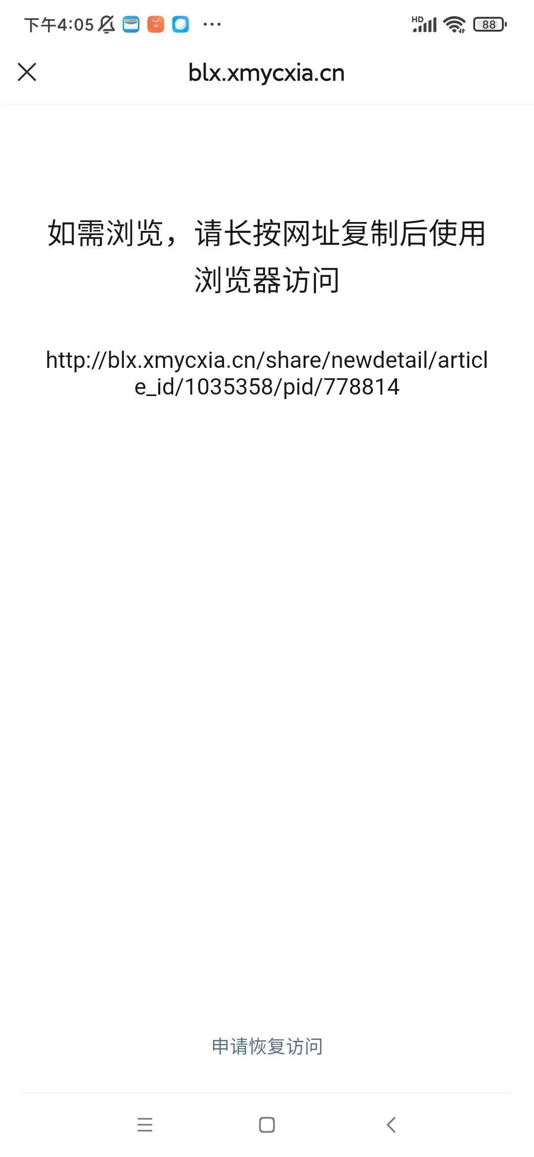 你好,经审核,域名【xmycxia.cn】下的链接【http://dfyl.xmycxia.cn/videos/detail/uuid/230488/pid/815517/type_id/8?report=】的内容存在违反《微信外部链接内容管理规范》的第2.9条“垃圾广告类内容”,请排查并把域名下相关违规内容修改后进行申诉;申诉方式可点击停止访问页底部入口进行操作,我们会在三个工作日处理,请耐心等待。 详细规则请参考《微信外部链接内容管理规范》http://weixin.qq.com/cgi-bin/readtemplate?t=weixin_external_links_content_management_specification