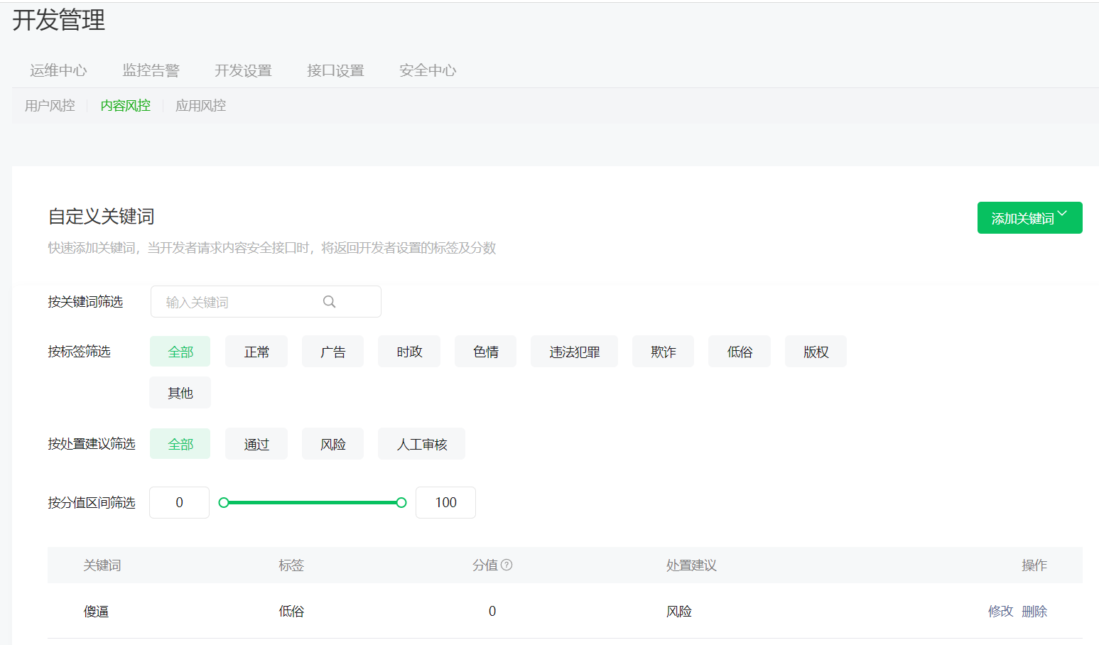 小程序中使用了security.msgSecCheck进行了安全内容检测,但无论什么词都返回通过,而且已经在小程序后台配置了相关敏感词语,但接口还是检测不到敏感信息,请求帮忙看看怎么回事?