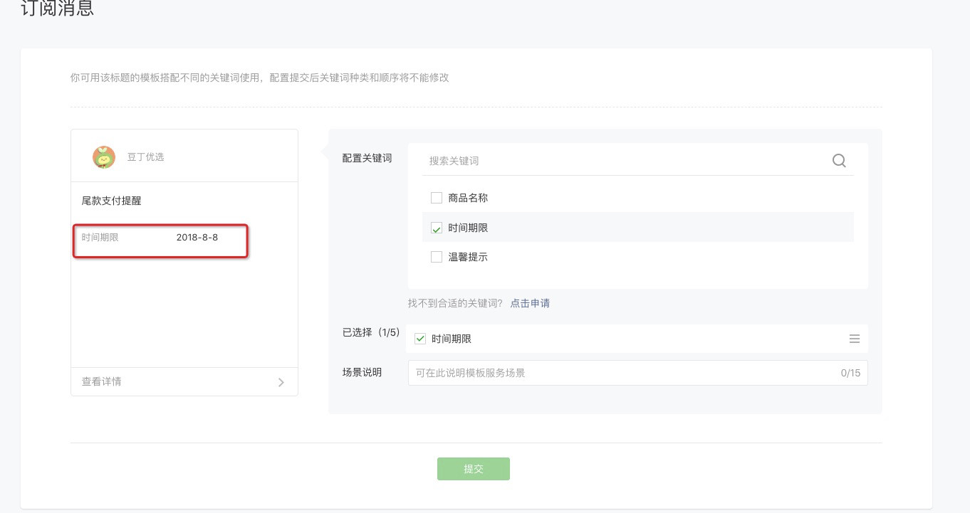 我在这个小程序中,想把时间期限改变成thing,告知我已有字段,但是没看到有删除关键字的相关按钮?