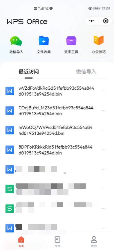 苹果手机测试是OK的,可以在小程序内部打开(和其他pdf/ppt等一样),不需要跳转WPS Office;Android和鸿蒙操作系统的手机都出现上面问题,实际上之前是可以打开的(不记得是小程序内部还是WPS Office了),而且经过测试在WPS Office小程序内是可以打开下载的临时文件的(虽然在我的小程序中打不开但进入WPS Office小程序可以看到最近打开Word文件的记录,直接点击就可以打开),如下图: