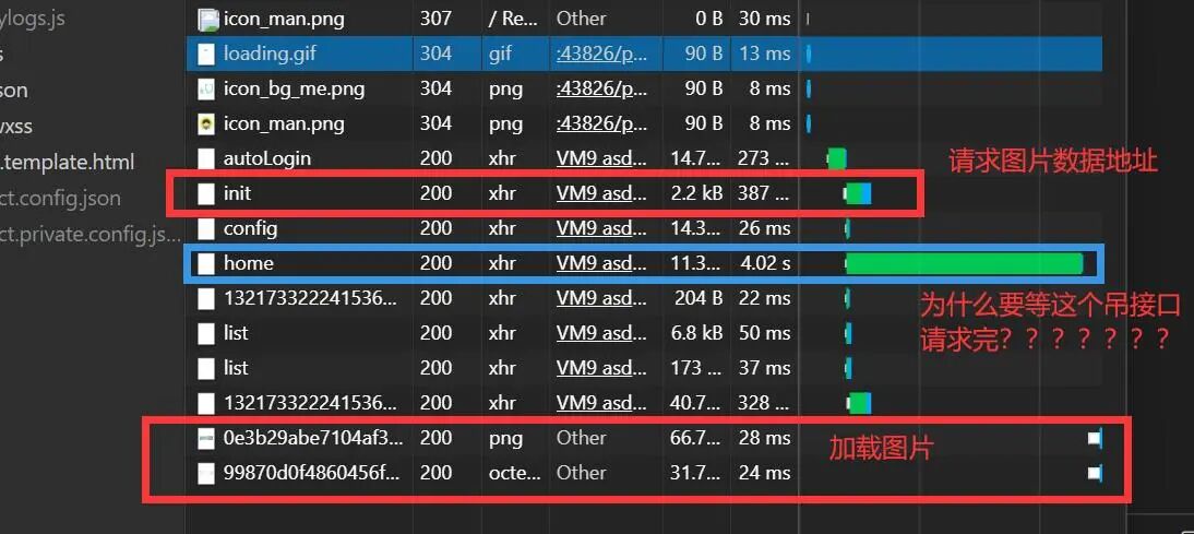 home不是你首页的渲染吗?下面两个图片是不是通过JS请求的外部地址,所以在首页渲染完后执行。不过你这个开屏4秒属实页有点慢了。