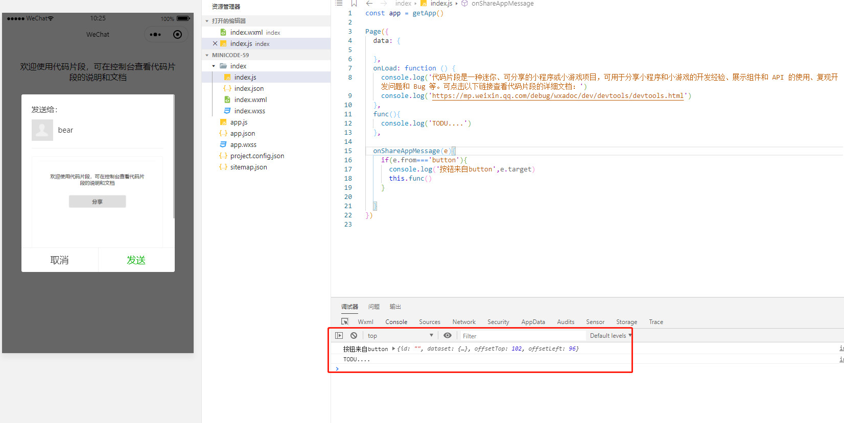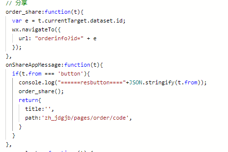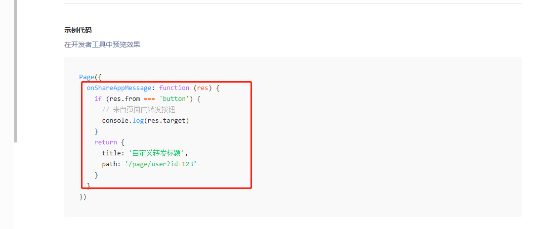 // 可以在成功回调里执行试试 // 提前把你要的数据提升到全局就不需要绑定额外事件 onShareAppMessage(e){ return wx.navigateTo({ url: `test?id=${this.id}`, success:(res)=>{ return { title: this.title, path: `/page/user?id=${this.id}` } } })可以在 onShareAppMessage 里边判断是否来自按钮点击分享