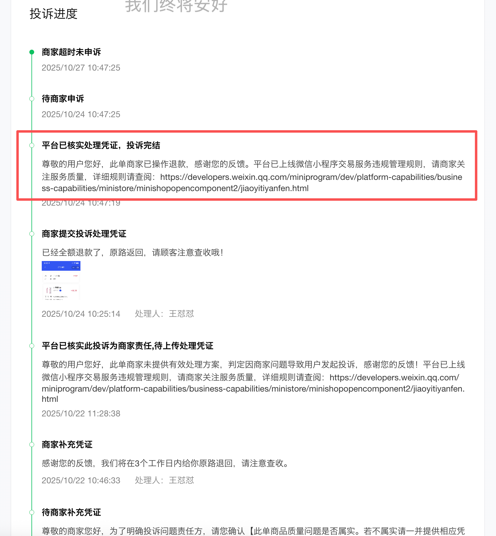 详见:交易类小程序纠纷投诉能力处理指引官方文档https://developers.weixin.qq.com/community/develop/doc/000e069b87462008789b3eeb851c09
