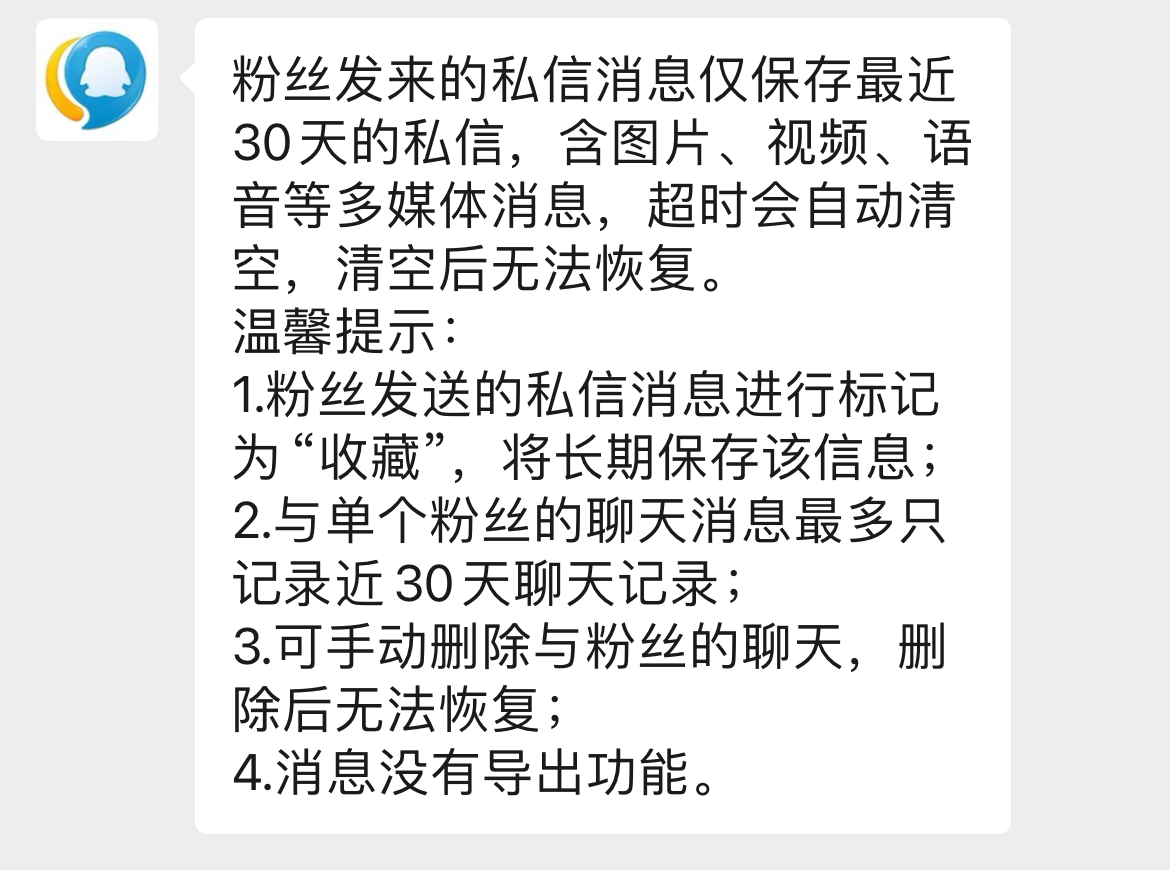 目前将粉丝发送的私信标记为“收藏”是永久保存的。