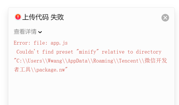 新版微信开发者工具v1.02.1905212,上传代码失败(旧版v1.02.1904090功能是正常的),提示如下: