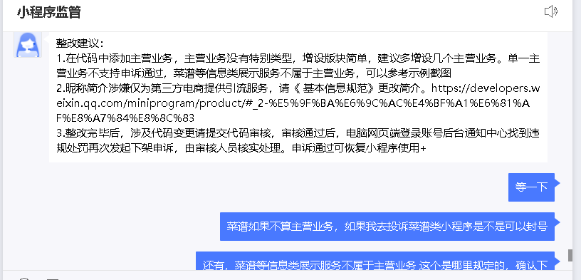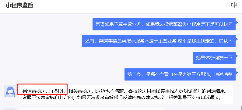 意思是,客服核查你的小程序没有认认真真做菜谱的,意图只是想引流或者作用于其它途径 问题在这里