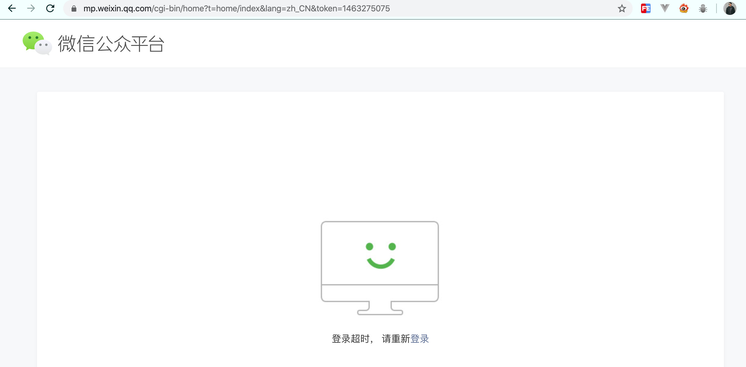 4.在https://mp.weixin.qq.com/登录微信公众号,输入账号、密码、手机扫码确认登录,页面进行跳转,会直接跳转到这个页面,告诉我登录超时,请重新登录