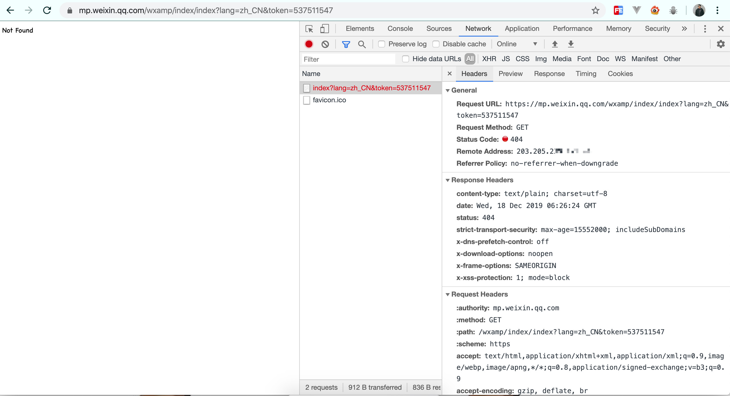 2.输入小程序的账号、密码,微信扫码确认登录,网页跳转到首页:https://mp.weixin.qq.com/wxamp/index/index?lang=zh_CN&token=537511547;页面直接报错 not found