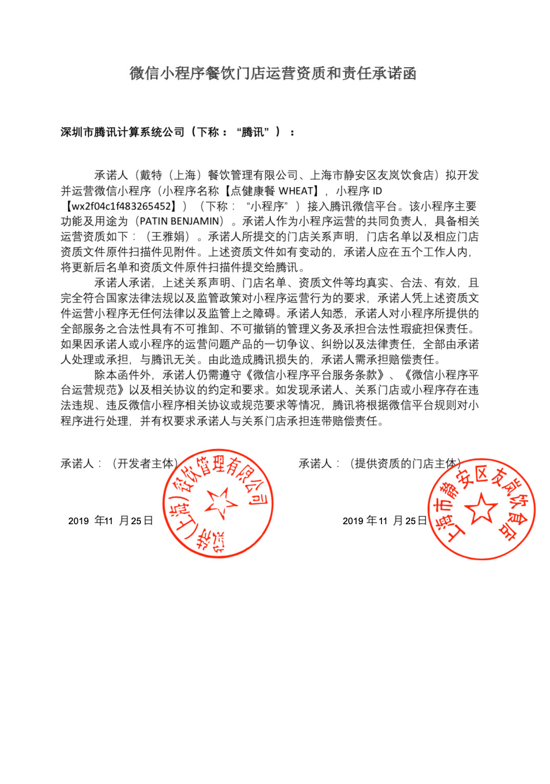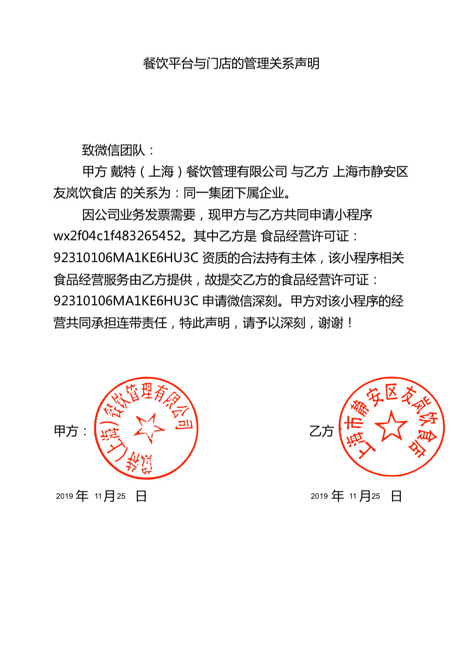 你好,用户提供的关系声明,未在公开渠道核实到相关信息,故提供的关联关系不能支持,建议用小程序注册主体申请餐饮相关资质 或 以资质主体做小程序申请“餐饮-餐饮服务场所/餐饮服务管理企业”类目。