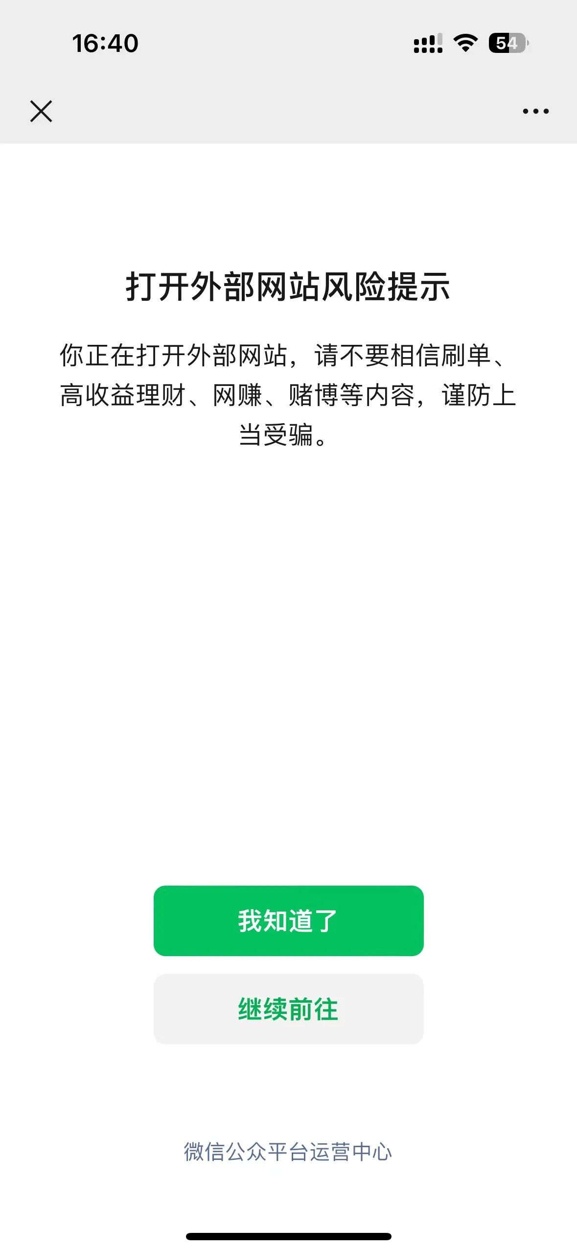 为什么我的公众号打开做的公众号链接,还是显示是打开外部网站有风险提示呢?网页授权、业务域名、JS接口安全域名 都做了授权,还是不行。