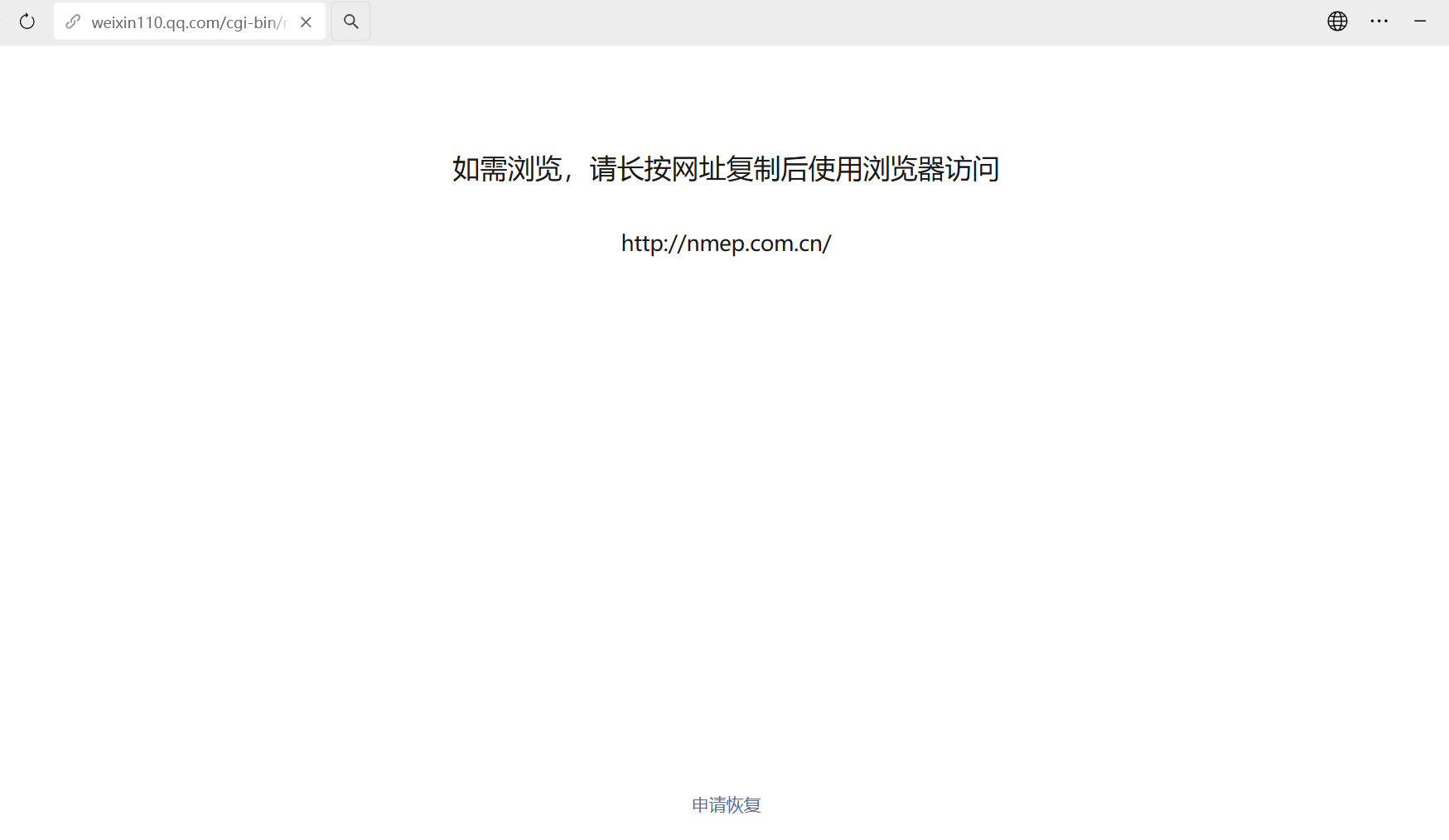网站域名是nmep.com.cn ,在微信打开是被提示“如需浏览,请长按网址复制后使用浏览器访问”,但网站无任何不良信息,资质齐全,有备案、有ICP证书。上一次反馈的有问题链接已处理掉,且经过腾讯网址安全中心检测,结果为“暂未发现风险”。请协助检查解封。