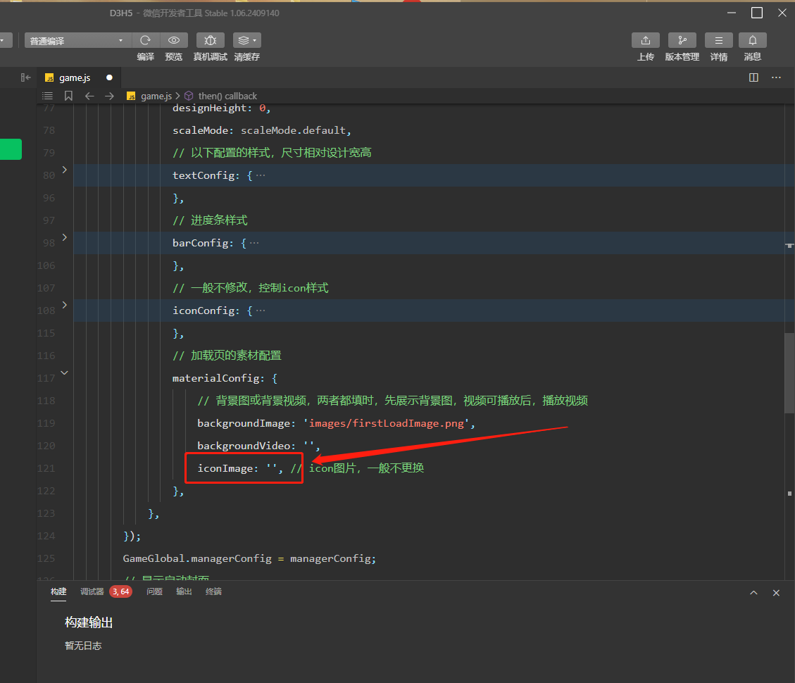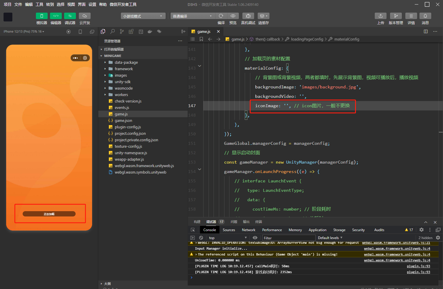 情况描述:unity转小游戏工程,导入小游戏工程后,将game.js 中的 materialConfig.iconImage设置为空(参见下图1),然后使用模拟器预览。可观察到模拟器界面预览界面未刷新的异常,将此字段还原,则预览界面刷新恢复正常。此问题必现。