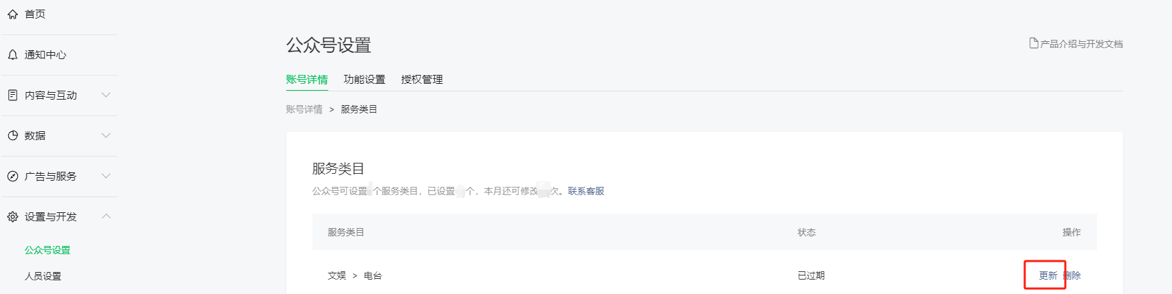 类目更新入口可以在微信公众平台登录公众账号后,在【设置与开发】-【公众号设置】-【服务类目详情】页面查看即将到期需要更新的类目,点击【更新】即可进入提交更新资质入口,审核通过后即完成更新。