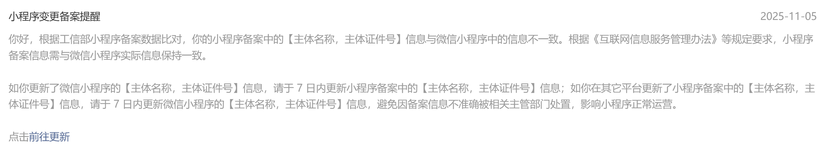 小程序进行了主体变更,导致备案信息中主体名称和证件号与小程序中信息不一致怎么办?