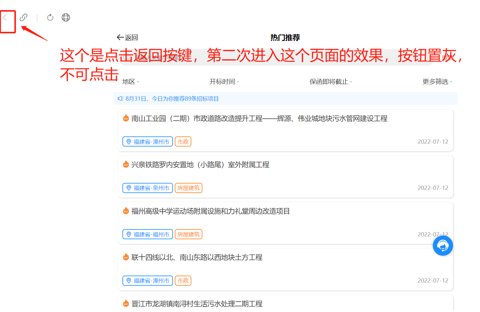 uniapp项目,微信pc端打开网站,内部使用uni.navigateTo做跳转页面,使用浏览器自带的返回按键,切换页面第一次返回可以,继续切换页面,返回按键置灰。网站链接http://wx.toubiaole.com/h5/