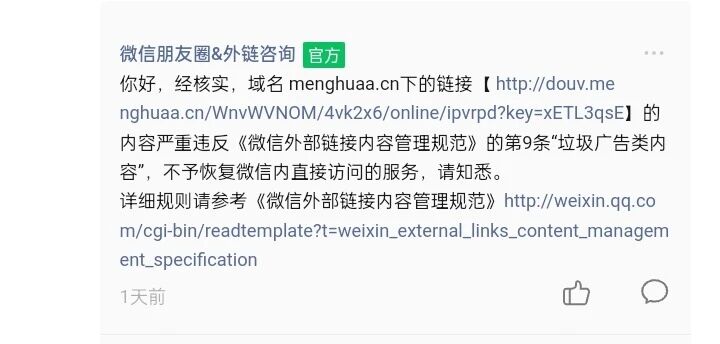 我是menghuaa.cn域名的合法持有者,最近这个域名在微信里的访问权限被你们拦截了,之前咨询得到的说法是违反了《微信外部链接内容管理规范》第9条的“垃圾广告类内容”,但你们从头到尾都没给我具体说明到底哪部分内容违规、依据是什么。我自己把域名下所有内容都仔细查过了,根本不存在符合“垃圾广告类内容”定义的信息,我一直是合规运营这个域名的。现在我得明确告诉你们:你们在没拿出有效违规证据、也没完整告知我具体情况的前提下,直接限制我域名的访问权限,这已经侵害到我合法的运营权益了,既不符合《民法典》里保护民事主体合法权益的规定,也和你们跟用户之间的服务约定不匹配。我现在要求你们,从收到我这话开始算,3个工作日之内,把这个域名所谓违规内容的完整证据、判定的具体依据都书面告诉我,同时立刻恢复menghuaa.cn在微信里的正常访问权限。要是你们在这期限里没做到这些,或者拿不出合法有效的违规证据,那我只能委托律师,要么向监管部门投诉,要么直接起诉,到时候你们得承担我所有的损失,包括运营受影响的损失、律师费还有维权的各种成本。希望你们能按合法合规、公平公正的原则处理我的诉求,别到最后闹成法律纠纷。
