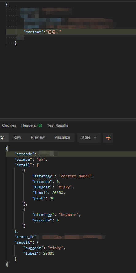 以TraceId:630ddf0e-1472bef1-6e69bd45为例,实际传入的content为\u5***\u9***。