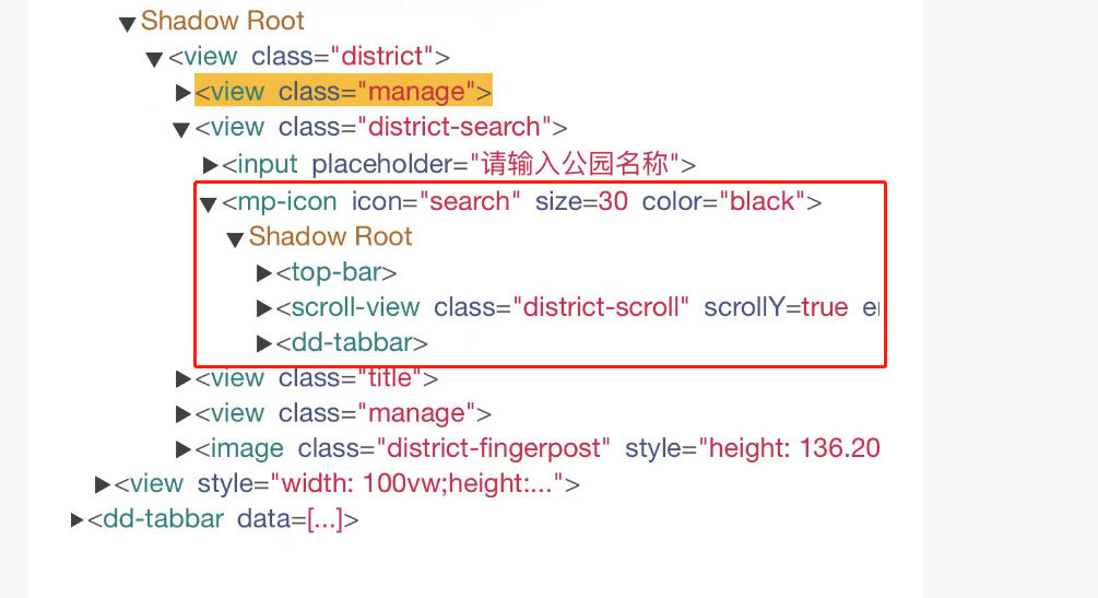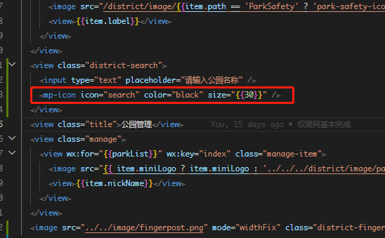 <view class="district-search"><input type="text" placeholder="请输入公园名称" /><mp-icon icon="search" color="black" size="{{30}}" /></view>
