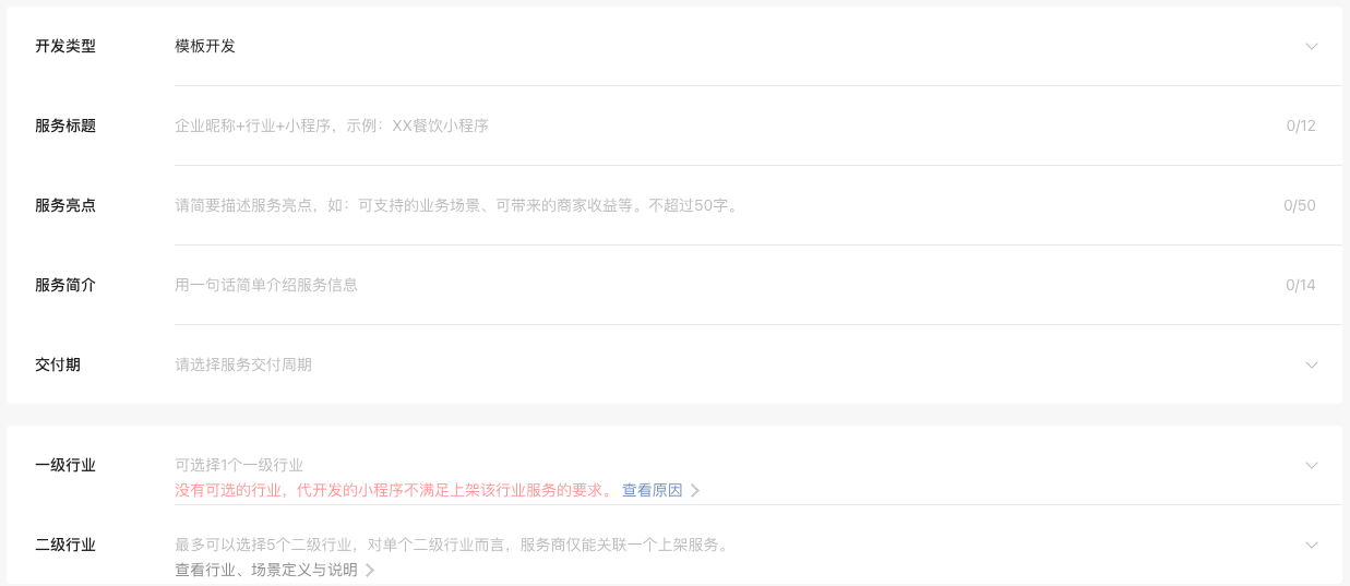 行业处展示“没有可选的行业,代开发的小程序不满足上架该行业服务的要求”。