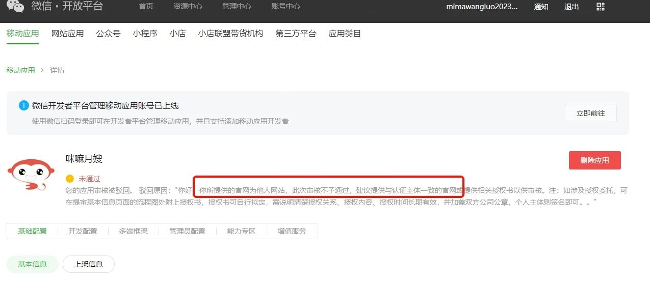 您的应用审核被驳回。 驳回原因:"你好,你所提供的官网为他人网站,此次审核不予通过,建议提供与认证主体一致的官网或提供相关授权书以供审核。注:如涉及授权委托,可在提审基本信息页面的流程图处附上授权书,授权书可自行拟定,需说明清楚授权关系、授权内容、授权时间长期有效,并加盖双方公司公章,个人主体则签名即可。