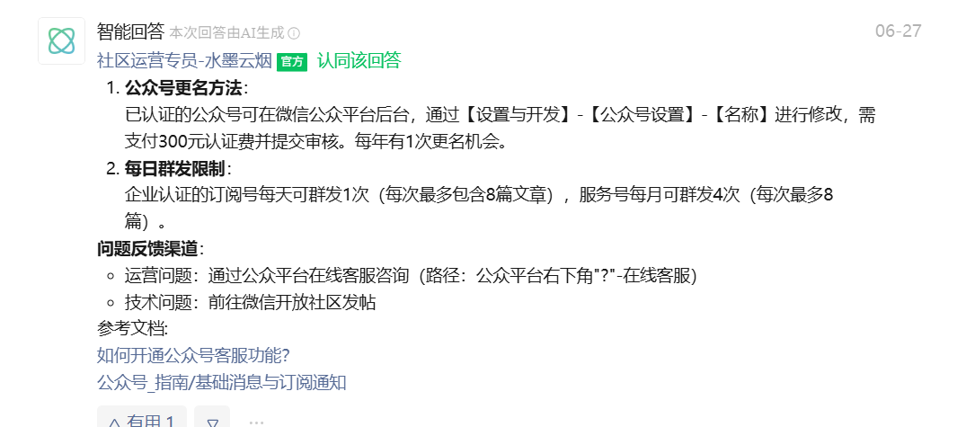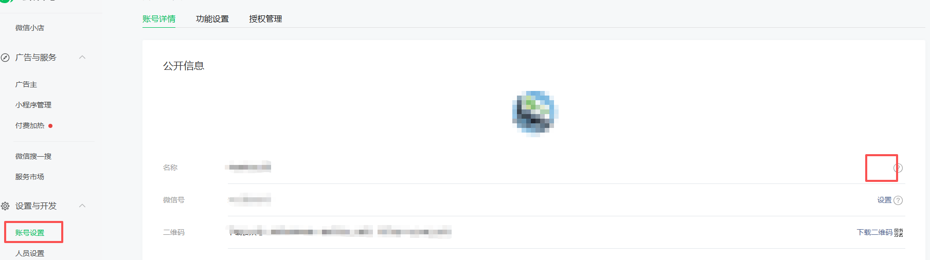 官方评论是这样的,但是我家公众号【设置与开发】后没有公众号设置,名称后面也没有修改,请问这个如何修改