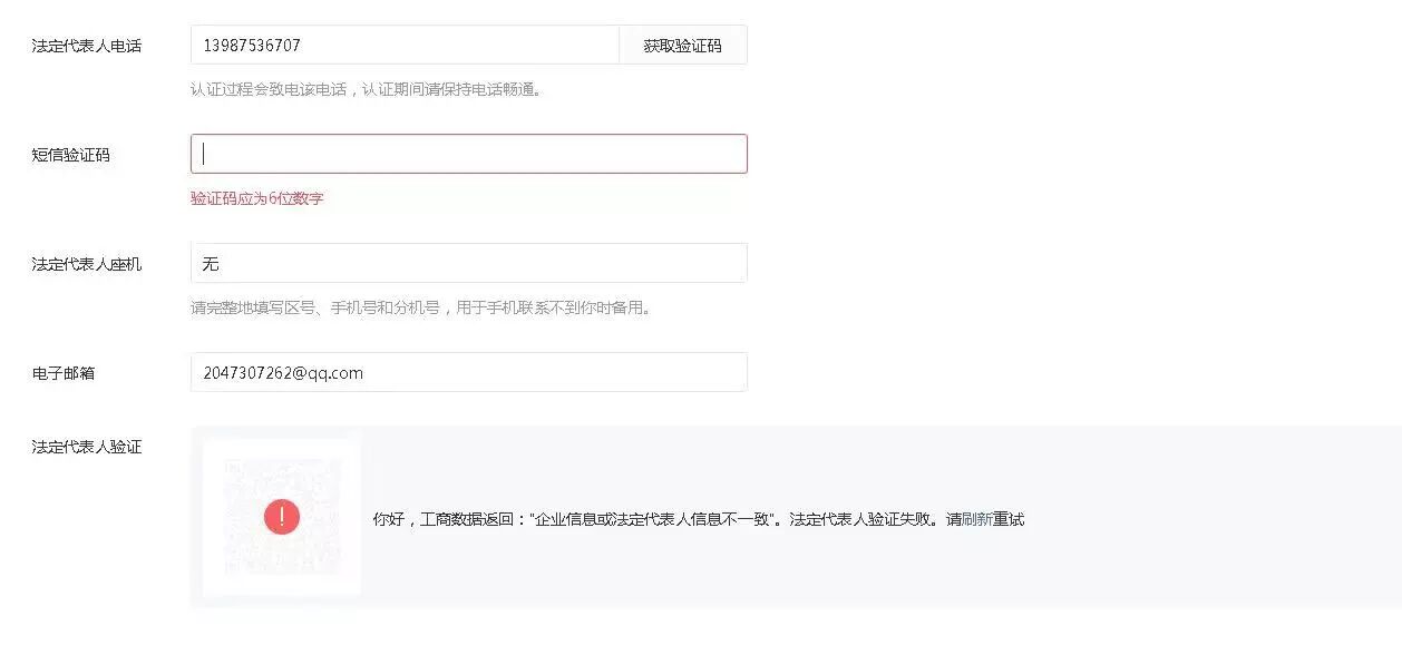 你好,工商数据返回:“企业信息或法定代表人信息不一致”。法定代表人验证失败。请刷新重试